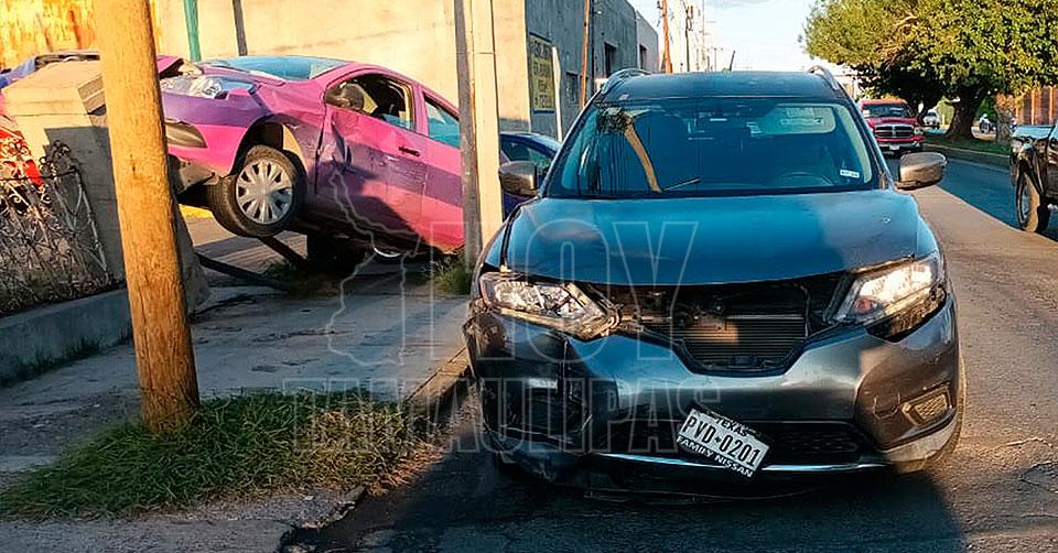 Nuevo Laredo, Tamaulipas.— Un aparatoso accidente se registró en calles de la colonia Hidalgo de Nuevo Laredo, cuando el conductor de una camioneta invadió la vía de preferencia y chocó contra un automóvil que terminó trepado en la barda de un inmueble.