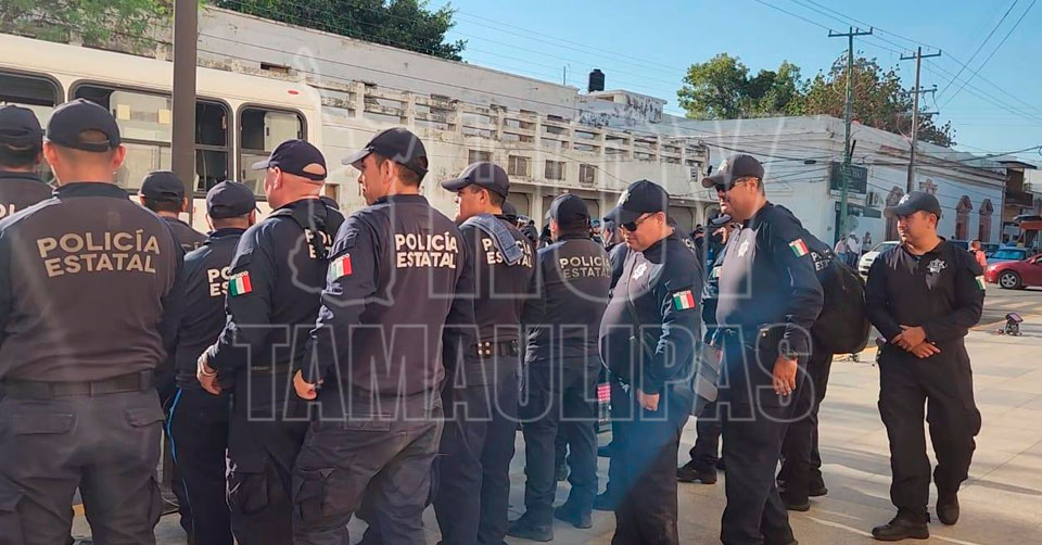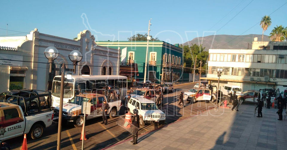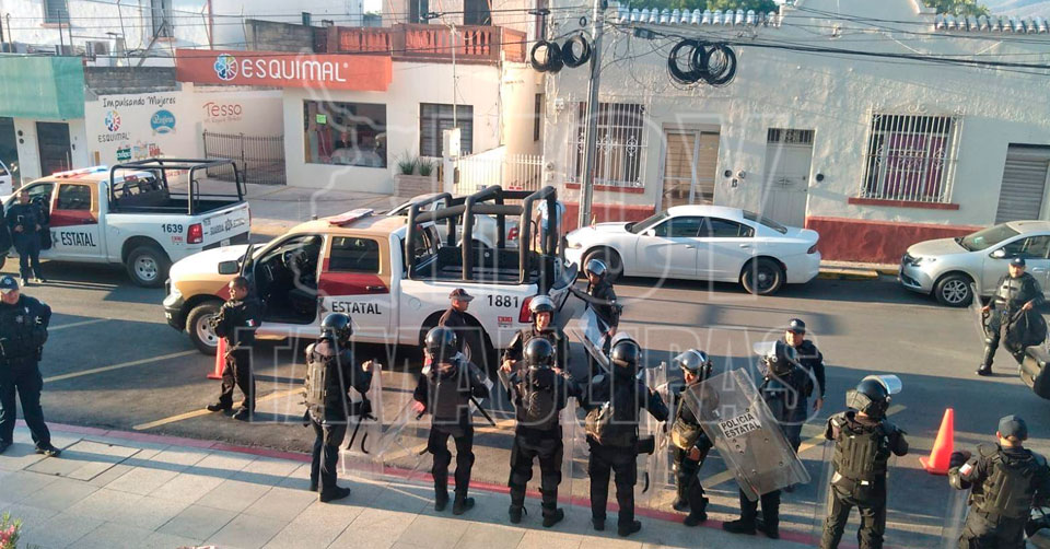 Ciudad Victoria, Tamaulipas. - Con la llegada de cientos de maestros a la plaza del 15 Hidalgo, unos 200 elementos de Seguridad Pública entre policías antimotines y de la Guardia Estatal, resguardaron las instalaciones del Palacio de Gobierno, cerrando el acceso al público.
