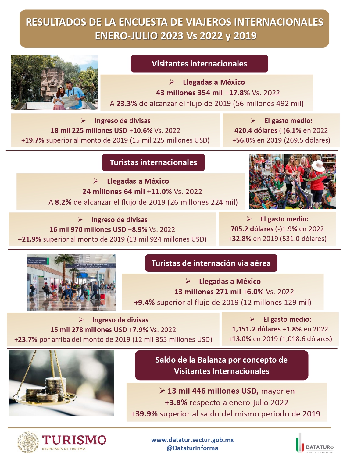Comentó que el ingreso de divisas por turistas de internación vía aérea entre enero y julio de 2023 tuvo un aumento de 7.9% contra el mismo periodo de 2022, al registrar 15 mil 278 millones de dólares, lo que representa también un incremento del 23.7% respecto a los 12 mil 355 millones de dólares captados en el mismo periodo de 2019.