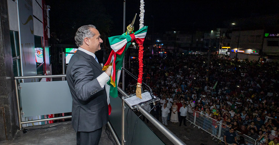 Ciudad Madero, Tamaulipas. - En Ciudad Madero, un municipio de grandeza y donde se avanza con esperanza, el alcalde Adrián Oseguera Kernion, hizo vibrar el corazón de los ciudadanos al salir del balcón presidencial la noche de este viernes 15 de septiembre, para dar el grito que honra a quienes dieron su vida por la Independencia de México y ondear con firmeza la Bandera Nacional en presencia de familias maderenses.
