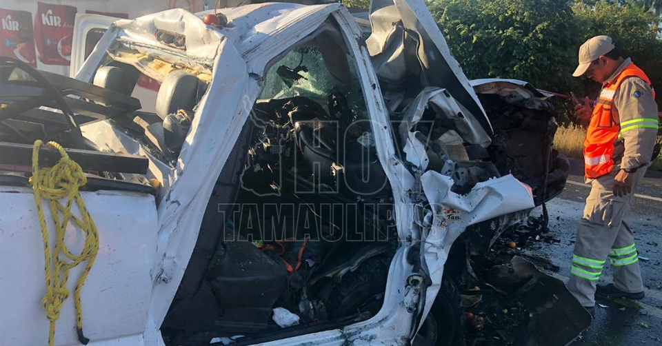 Tampico, Tamaulipas. - Un comerciante quedó prensado entre los hierros retorcidos de su camioneta, después de colisionar con otra unidad distribuidora de carnes frías en el Libramiento Poniente de Tampico.