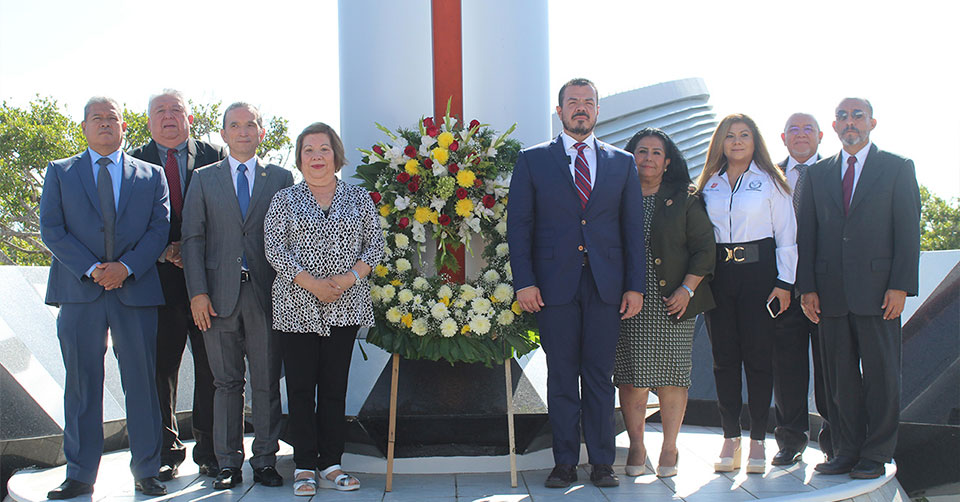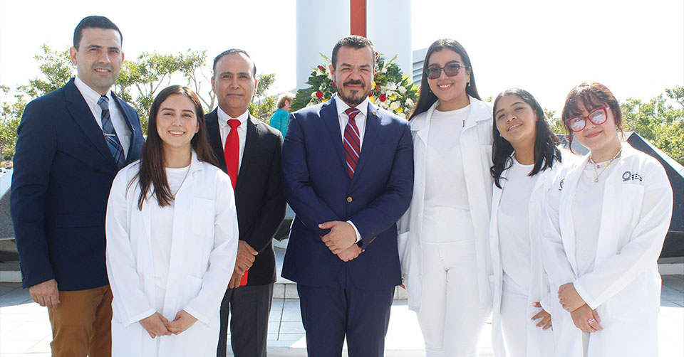 Como parte del protocolo, el C. P. Guillermo Mendoza Cavazos realizó la guardia de honor y colocó una ofrenda floral, acompañado de la Mtra. Elda Ruth de los Reyes Villarreal, directora de la Facultad de Derecho y Ciencias Sociales (FADYCS); y del Dr. Raúl de León Escobedo, director de la Facultad de Medicina de Tampico.