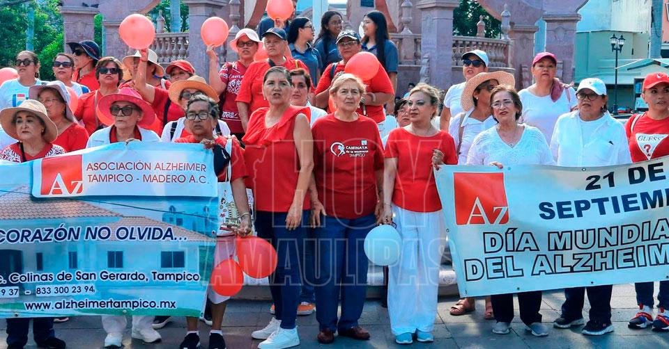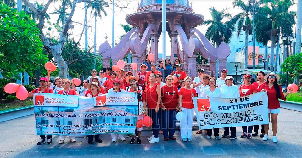 Tampico, Tamaulipas. - Con una breve caminata y un acto en la Plaza de Armas de Tampico, frente al Palacio Municipal, integrantes y familiares de pacientes de la Casa Alzheimer y de la Asociación de Alzheimer de Tampico-Madero A.C. recordaron el Día Internacional del Alzheimer, con la finalidad de hacer conciencia entre la comunidad sobre los desafíos que arroja la enfermedad entre la sociedad.