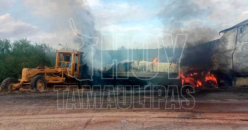Trailero muere calcinado tras chocar con motoconformadora en Nuevo Laredo