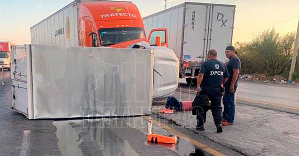 Nuevo Laredo, Tamaulipas.- Un conductor de un vehículo comercial resultó gravemente herido tras ser impactado y volcado por un tráiler en la Carretera Nacional, al sur de Nuevo Laredo.