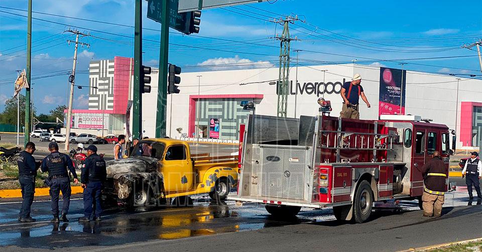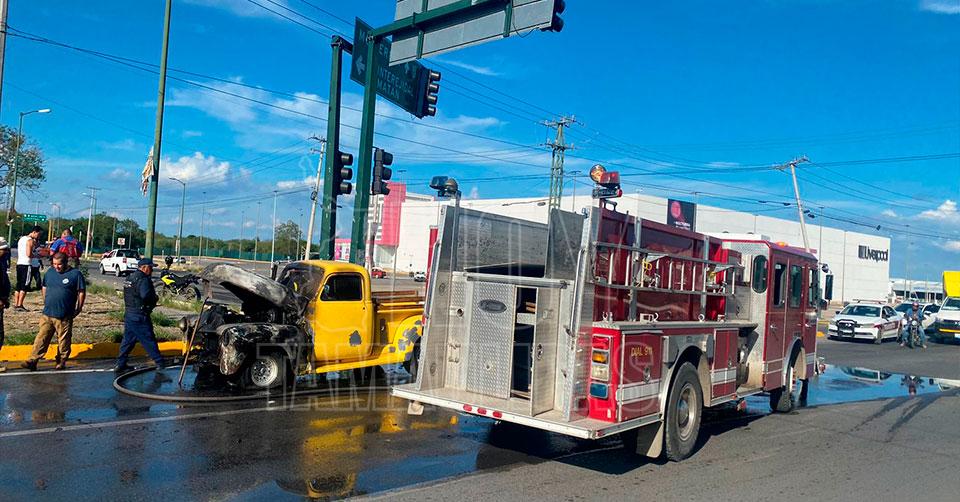 Ciudad Victoria, Tamaulipas. – Una camioneta de modelo antiguo terminó incendiada cuando era guiada sobre el Libramiento Naciones Unidas y salida a Monterrey en Ciudad Victoria.