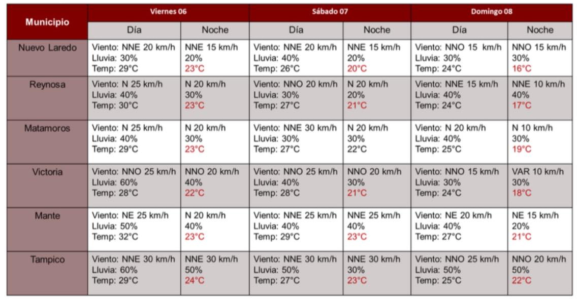 Por otra parte, la masa de aire frío que impulsa al frente número 4 ocasionará descenso de las temperaturas vespertinas sobre los estados de la Mesa del Norte, así como evento de Norte, con vientos de 40 a 60 km/h, a partir de esta noche y durante la madrugada del sábado, en las costas de Tamaulipas.
