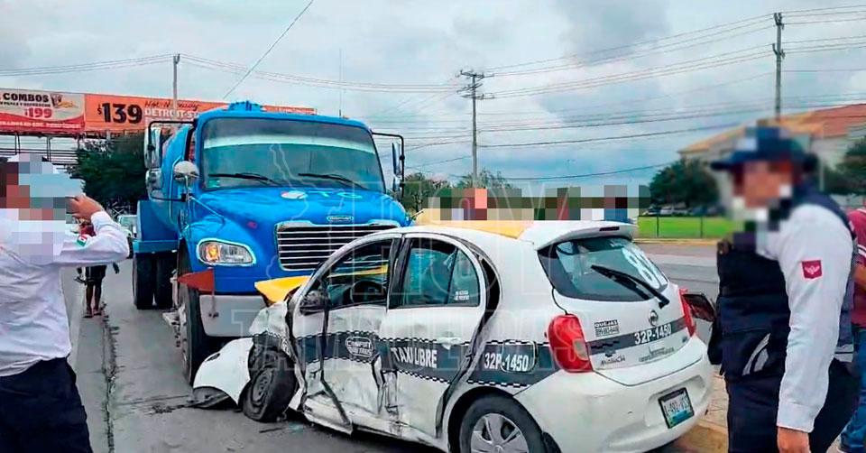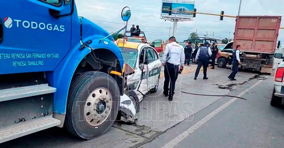 Tras el impacto el taxi se proyectó contra una pipa de gas, mientras que la patrulla chocó con un camión.
