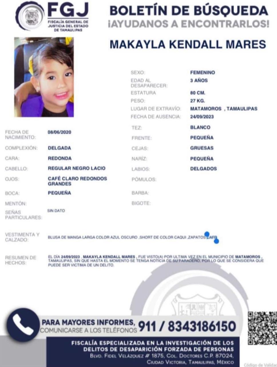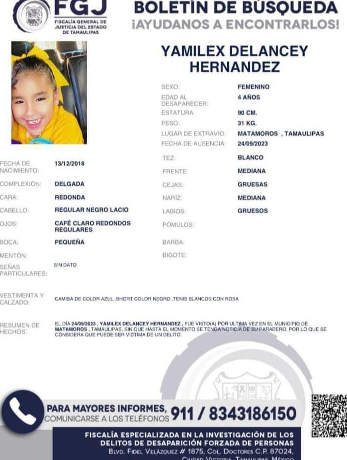 Matamoros, Matamoros. - Dos niñas, hermanas de 3 y 4 años son buscadas por las autoridades de la Fiscalía General de Justicia del Estado de Tamaulipas (FGJT), delegación Matamoros, tras una denuncia para su localización realizada por la madre.