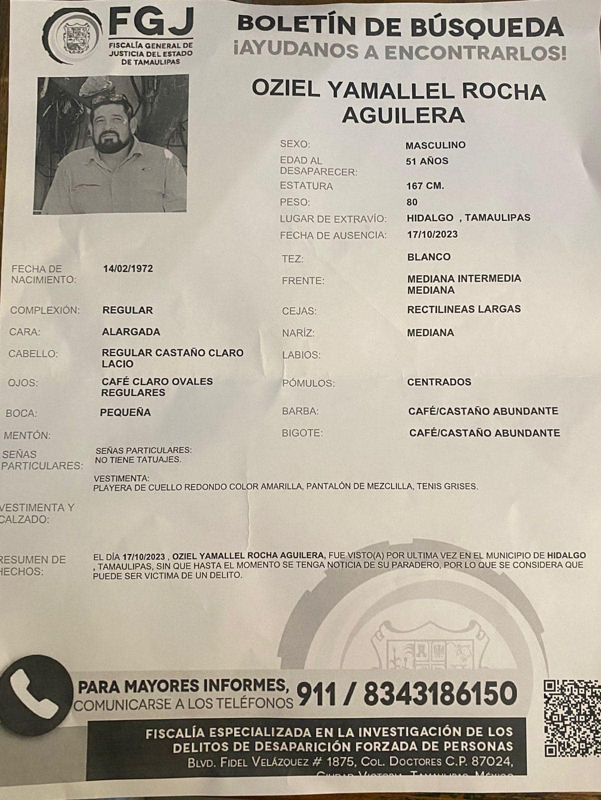 Ciudad Victoria, Tamaulipas. – La Fiscalía General de Justicia del Estado de Tamaulipas (FGJT) informó la desaparición de Oziel Yamallel Rocha Aguilera quien presuntamente fue visto por última vez en el municipio de Hidalgo.