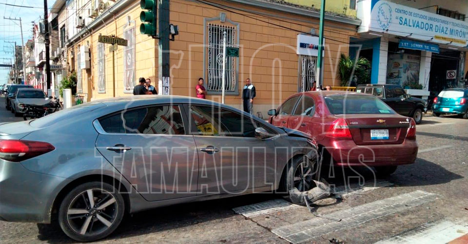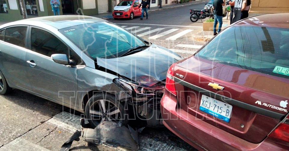En el sitio se dio a conocer que un automóvil Kia Forte color gris impactó en un costado a un Chevrolet Aveo rojo con placas de circulación del Estado de Tamaulipas, sin que por fortuna se reportaran personas heridas.