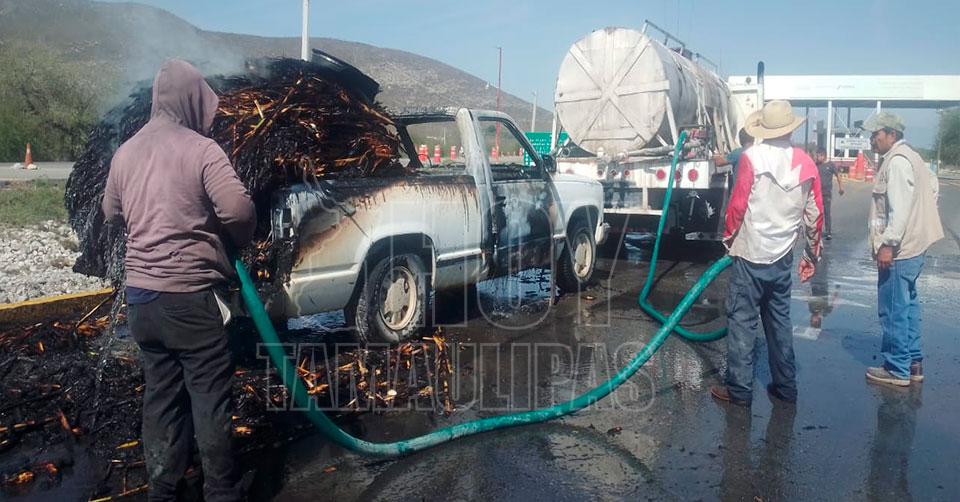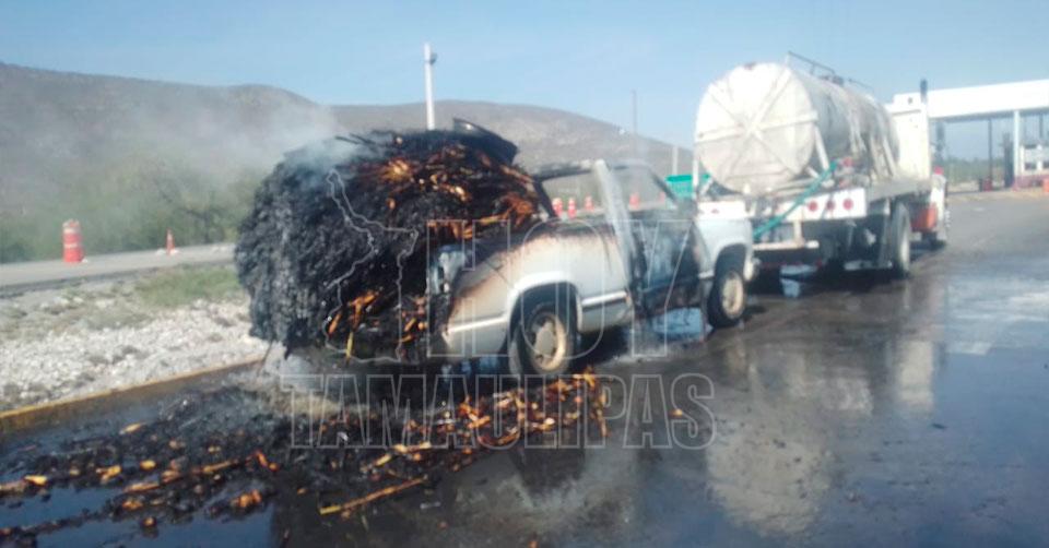 Tula, Tamaulipas. - Un probable corto circuito en el cableado eléctrico de una camioneta que transportaba alimento para ganado fue la causa para que se incendiara.