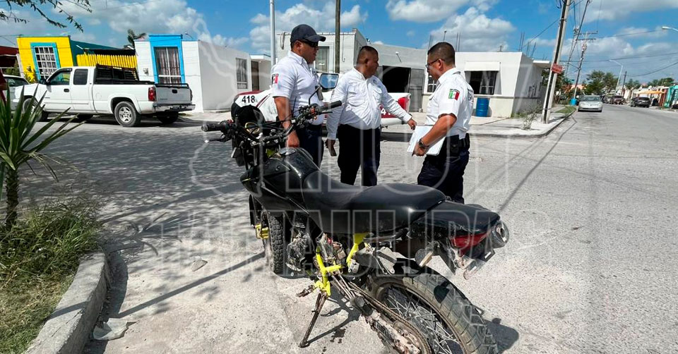 Fue en la calle Guinea con Corea del Norte del Fraccionamiento Misiones Fase II donde ocurrió el desigual accidente vial entre una moto y una Chevrolet Silverado blanca.