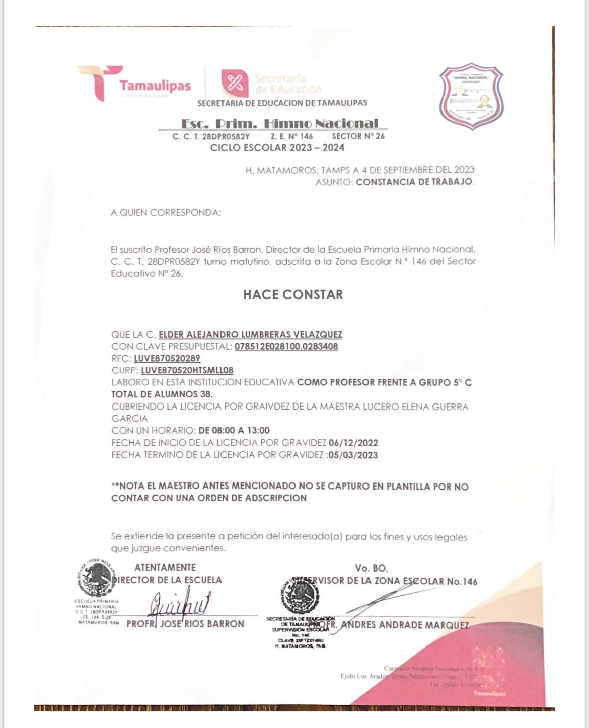 Matamoros, Tamaulipas. - Documentos oficiales de la Secretaría de Educación Pública (SEP) que se hicieron llegar a HOYTamaulipas demuestran que el regidor de Matamoros, Andrés Andrade Márquez, sigue en funciones como supervisor escolar de la zona 146 en esta frontera.