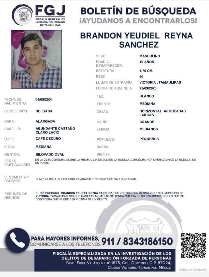 Ciudad Victoria, Tamaulipas. – La Fiscalía General de Justicia del Estado de Tamaulipas emitió un boletín de búsqueda para dar con el paradero de Brandon Yeudiel Reyna Sánchez.