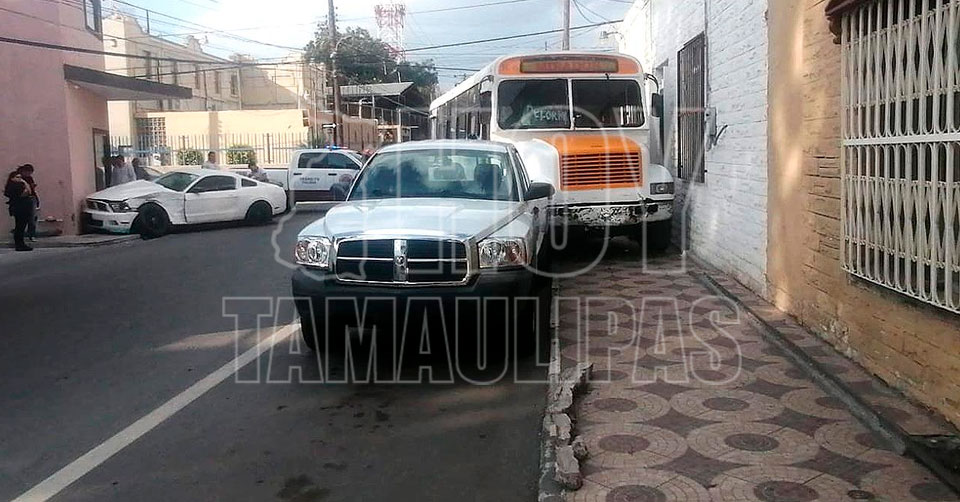 Nuevo Laredo, Tamaulipas.— Al invadir la vía de preferencia, el chofer de un automóvil provocó un aparatoso accidente en calles del sector Centro de Nuevo Laredo, en el que un camión urbano terminó chocando contra una camioneta estacionada, y él se proyectó hacia una barda.