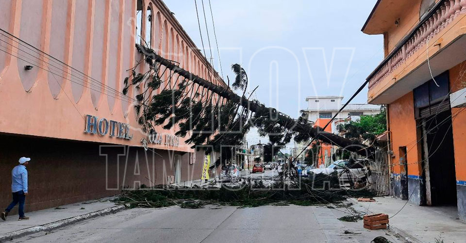 Tampico, Tamaulipas. - Un enorme árbol que no soportó los fuertes vientos que trajo consigo el frente frío número 8 cayó sobre la pared de un hotel y derribó un poste de energía eléctrica, sin que se registraran personas lesionadas del sector, reportándose únicamente daños a una unidad motriz y la infraestructura citada.