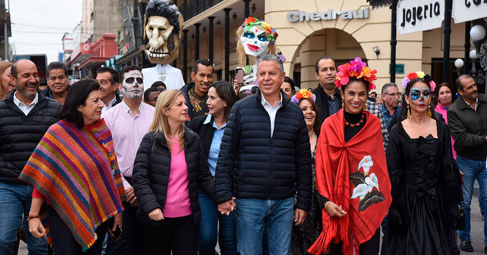 Tampico, Tamaulipas. - Con el propósito de fortalecer la identidad cultural y preservar las tradiciones ancestrales, el presidente municipal Chucho Nader y su esposa Aída Féres de Nader, titular del Sistema DIF encabezaron este día, la instalación de los altares de Día de Muertos ubicados en el Palacio Municipal y en el kiosco de la plaza de La Libertad, además de realizar una procesión entre ambos puntos.