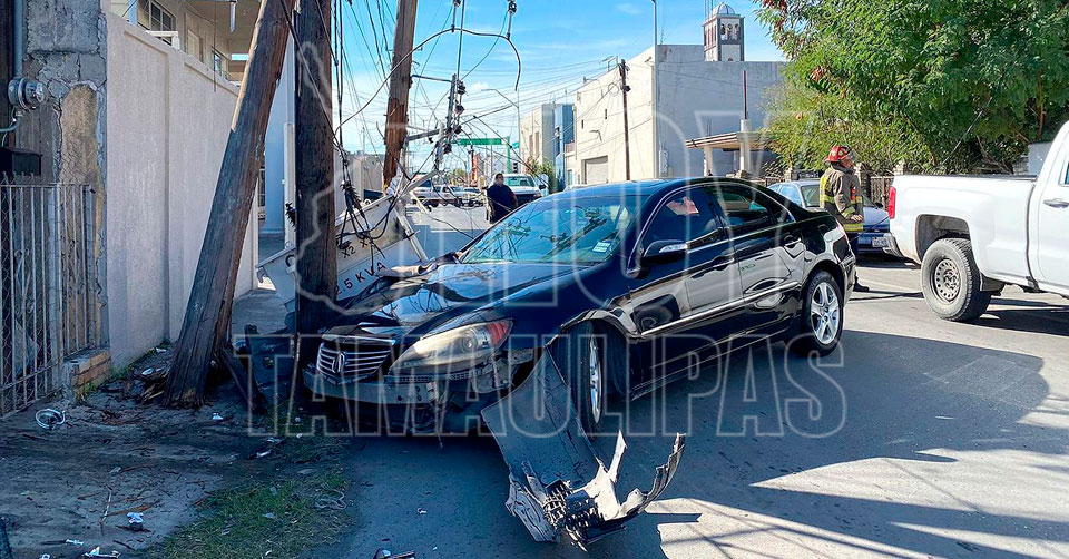 Nuevo Laredo, Tamaulipas.— Un accidente automovilístico ocurrido hoy en la avenida Juárez dejó sin luz a una parte de la colonia Juárez de Nuevo Laredo, luego de que un adulto mayor chocó su auto contra dos postes de madera, uno de los cuales sostenía un transformador eléctrico.