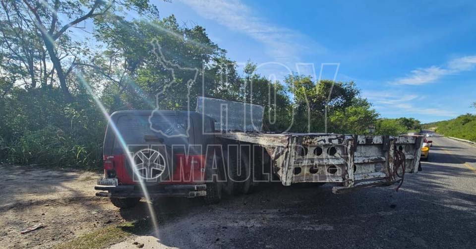 Villa de Casas, Tamaulipas. - Derivado del choque entre un camión de plataforma y un vehículo particular la circulación se encuentra cerrada en un carril de la Carretera Estatal 75 Villa de Casas-Soto la Marina.