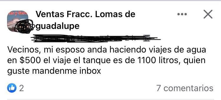 “Vecinos mi esposo anda haciendo viajes de agua en $500 el viaje el tanque es de 1100 litros, quien guste mande inbox”.