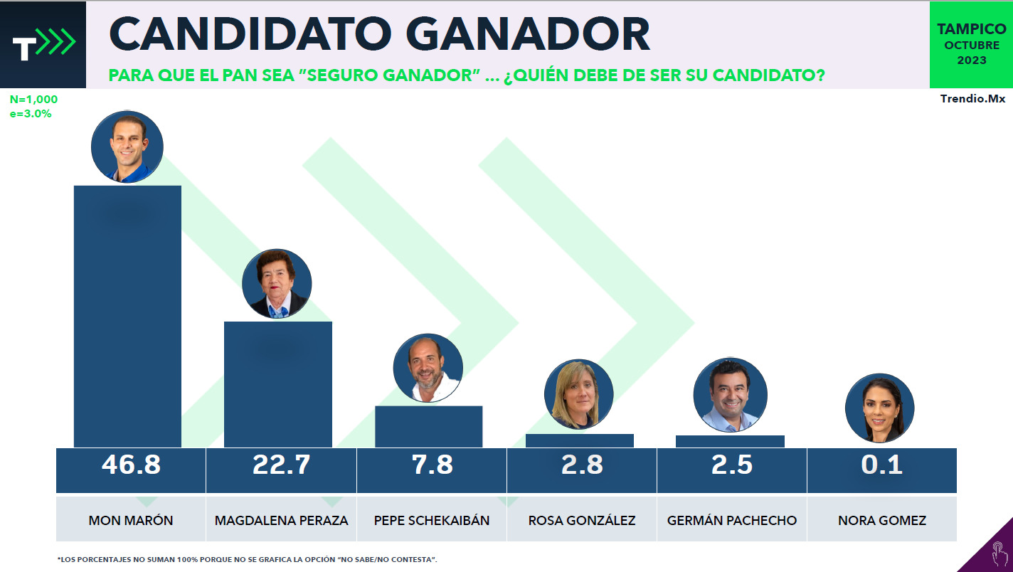 De acuerdo al estudio cuantitativo que tuvo un nivel de confianza del 95% y un margen de error del +/-3% y que se aplicó a mil ciudadanos en 100 puntos muestrales de la localidad, Marón obtuvo el 46.8 por ciento en la variable “Para que el PAN sea “seguro ganador”… ¿quién debe de ser su candidato?”.