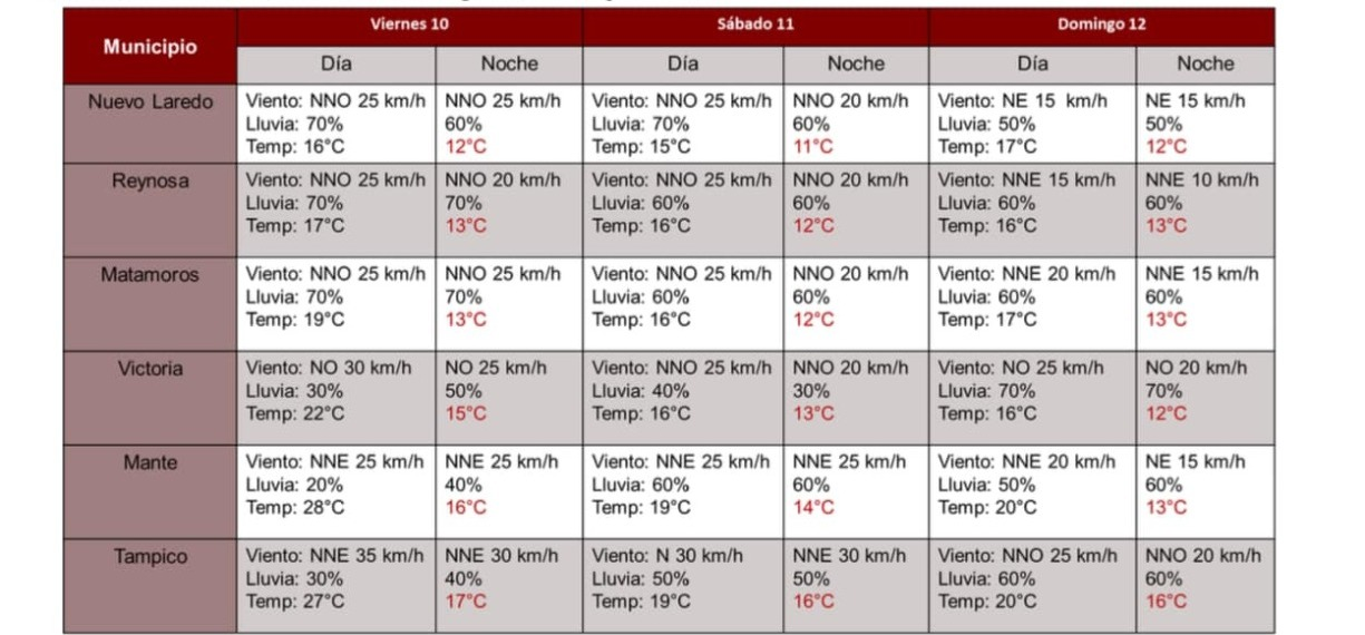 Ciudad Victoria, Tamaulipas. – La interacción del frente frío no. 9 y la corriente en chorro transportará humedad desde el océano Pacífico y Golfo de México propiciarán actividad de lluvias generalizadas a lo largo del fin de semana en Tamaulipas.