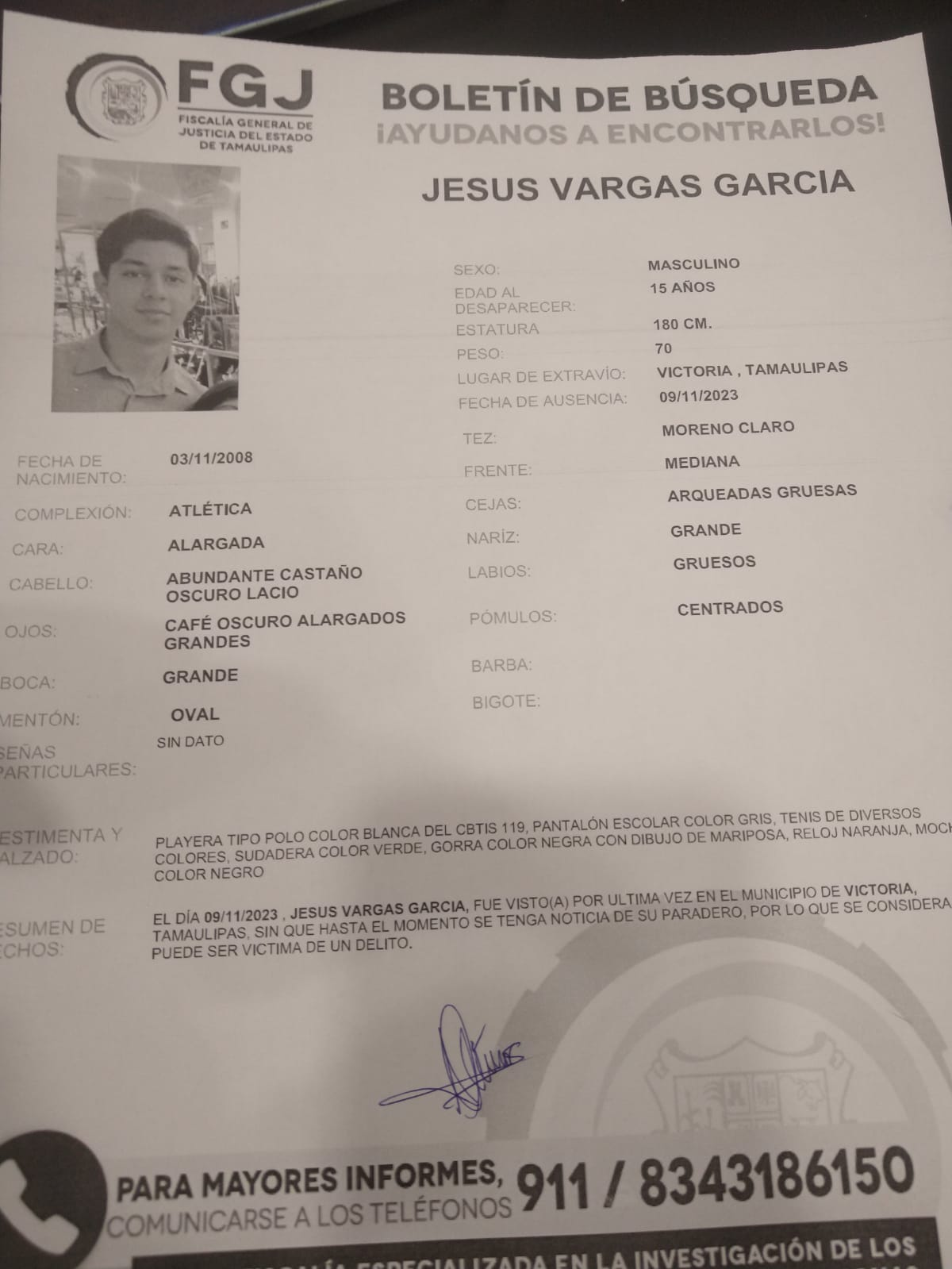 Ciudad Victoria, Tamaulipas. - El día 9 de noviembre de 2023, Jesús Vargas García de 15 años, fue visto por última vez en Ciudad Victoria, Tamaulipas y hasta el momento su familia se encuentra desesperada al no saber su paradero.