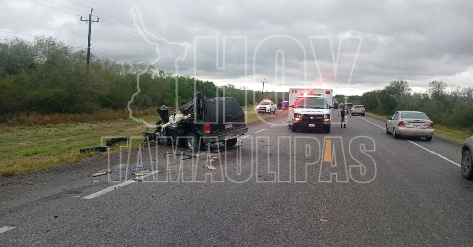 San Fernando, Tamaulipas. – Al menos una persona sin vida y dos más lesionados es el saldo preliminar de un fuerte accidente entre una camioneta tipo familiar y un camión de carga.