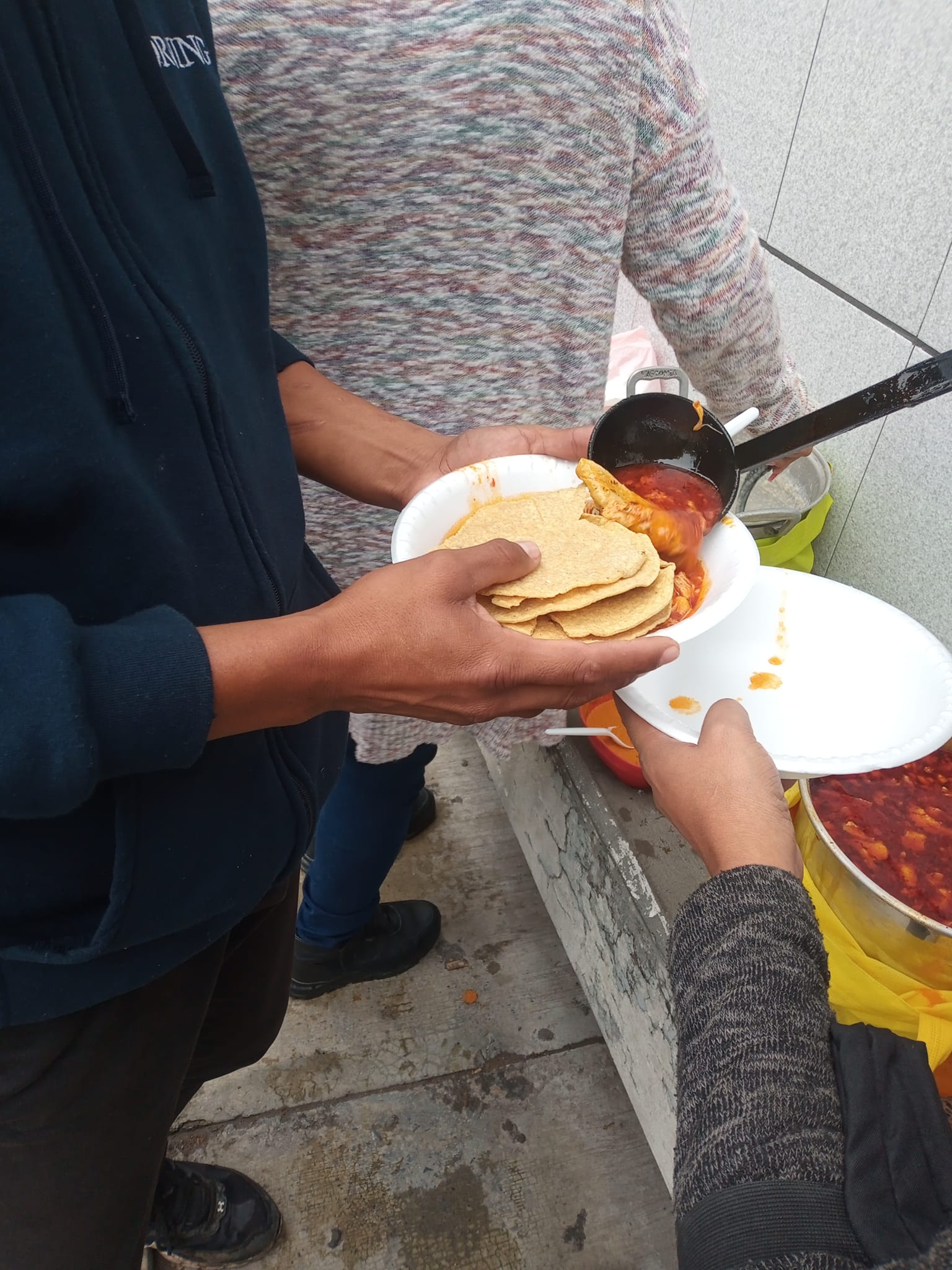 A las afueras del Hospital se observaron filas de personas que esperaban les sirvieran un plato de pozole acompañado con agua o un vaso de chocolate caliente con pan.