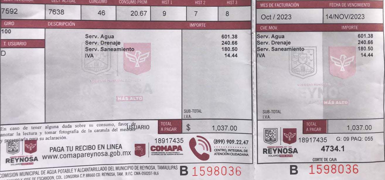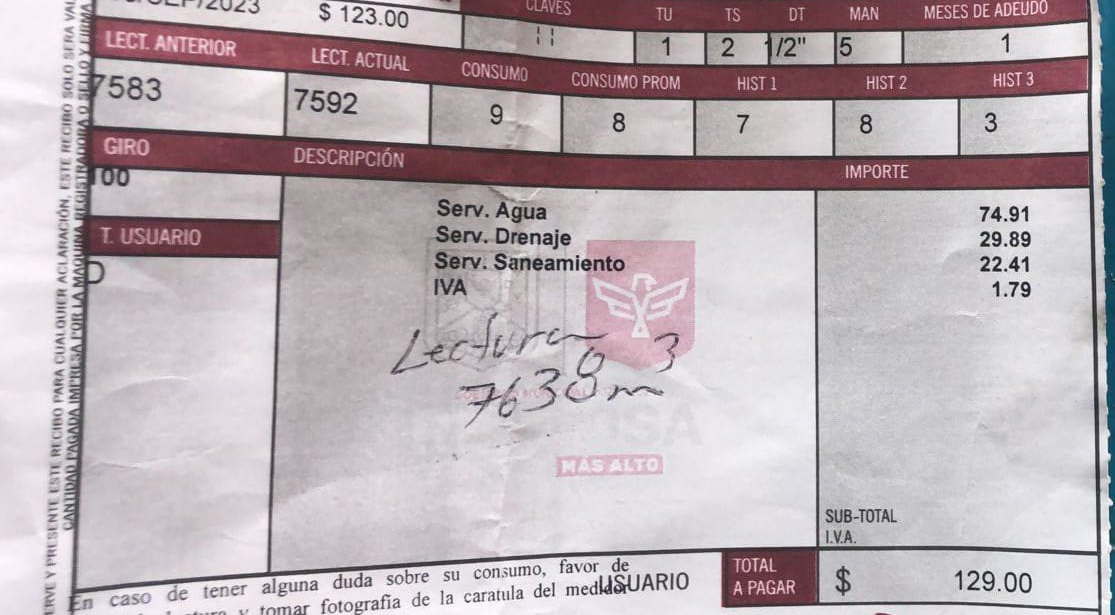 Señalaron que en el domicilio ubicado por la calle Río Purificación de la colonia Longoria, solo habitan dos personas, adultos mayores y tienen prácticamente el mismo consumo todos los meses, y se les hace muy raro que les haya llegado "muy caro su recibo de agua".