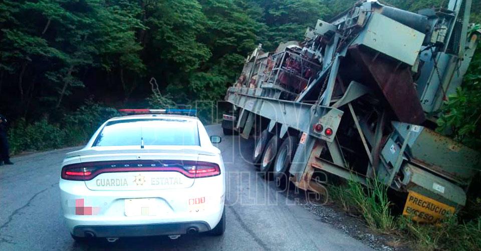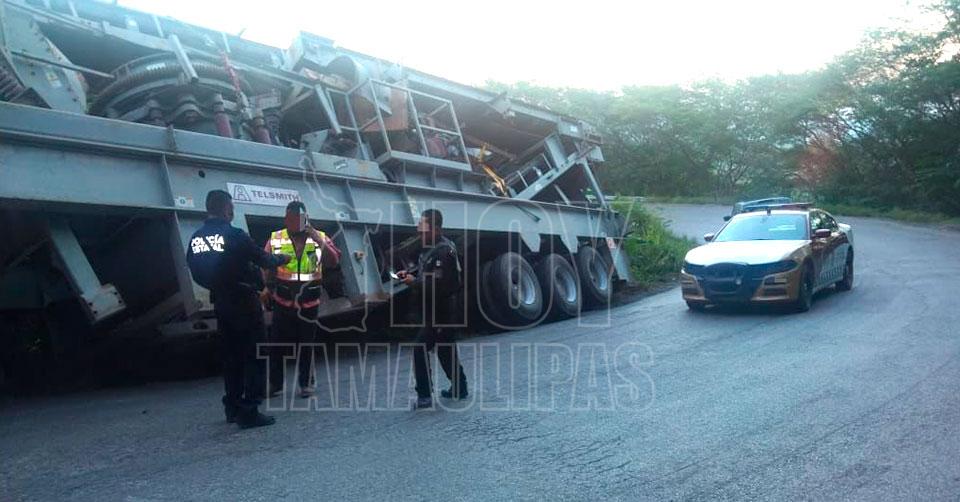Ciudad Mante, Tamaulipas. - Elementos de la Guardia Estatal auxiliaron a los ocupantes de un tráiler que remolcaba maquinaria pesada, luego de que se accidentó en la región de Ciudad Mante.