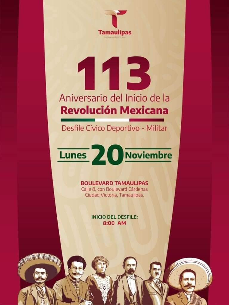 "El Gobierno del Estado de Tamaulipas te invita al desfile Cívico Deportivo - Militar conmemorando el 113 Aniversario del Inicio de la Revolución Mexicana", invita a la ciudadanía en su página oficial de Facebook.