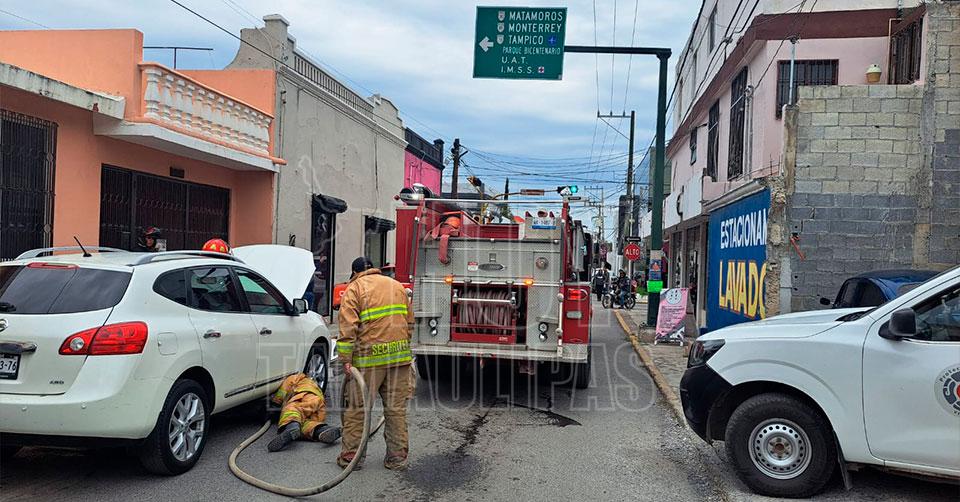 El siniestro se registró en el 15 Juárez, hasta donde llegaron los “tragafuegos”, quienes tras varias maniobras lograron sofocar las llamas que salían del motor.