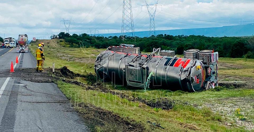 La volcadura ocurrió a la altura del kilómetro 45 y el auto tanque quedó por fuera de la cinta asfáltica en el tramo carretero Victoria-Zaragoza.