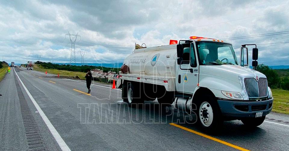 Ciudad Victoria, Tamaulipas. - Derivado de la volcadura de una pipa y el derrame de diésel que transportaba, la circulación vial continúa cerrada en ambos carriles de la Carretera Federal 83, tramo Zaragoza-Victoria.