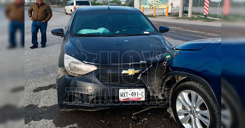 Nuevo Laredo, Tamaulipas.— Un choque frontal entre un automóvil y una camioneta se registró frente a la colonia Villas de San Miguel 3 en Nuevo Laredo, dejando sólo daños materiales.