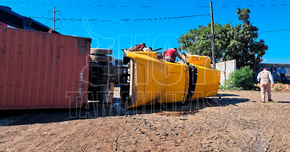 Altamira, Tamaulipas. - Un tráiler doble remolque que transportaba dos contenedores volcó al ser embestido en la parte media por el tren de Ferrocarriles Mexicanos.