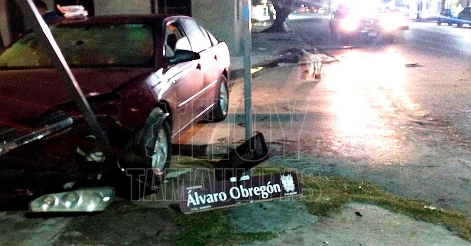 Nuevo Laredo, Tamaulipas. - Una mujer resultó lesionada al sufrir un accidente vehicular en la Avenida Álvaro Obregón en Nuevo Laredo, luego de tratar de esquivar a un perro que se cruzó en su camino y terminó chocando contra varios objetos fijos, entre ellos un arbotante.