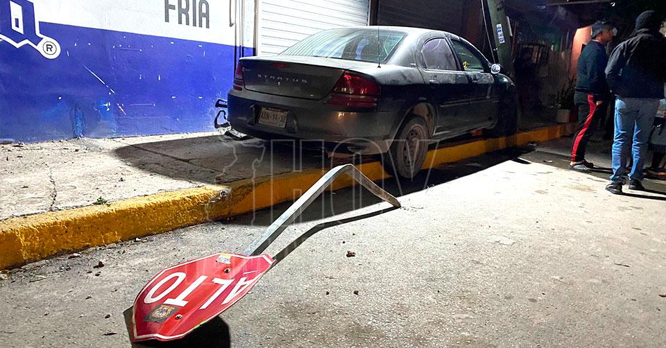 Tras el impacto el conductor del Stratus perdió el control al volante y se proyectó contra un poste y una señal de alto, quedando trepado sobre la banqueta.