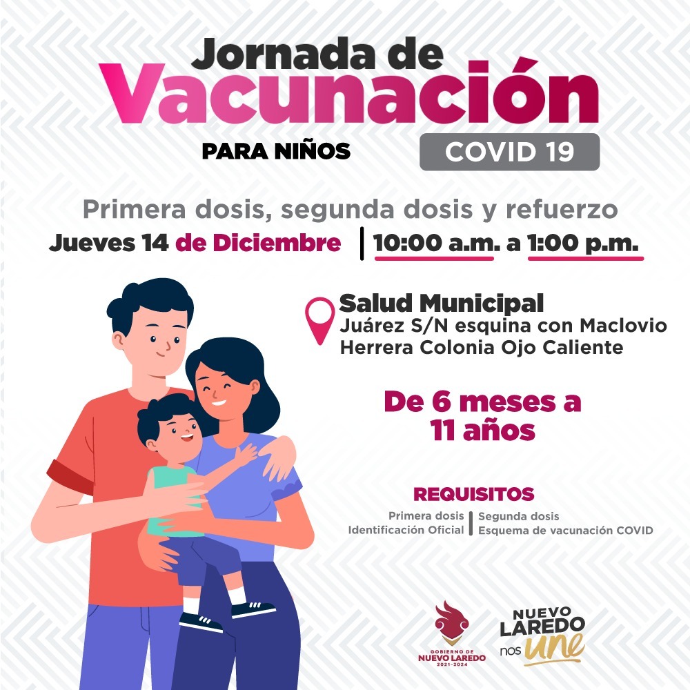Nuevo Laredo, Tamaulipas.-La Dirección de Salud Municipal llevará a cabo este jueves 14 de diciembre la Jornada de Vacunación Covid para niñas y niños de entre seis meses de edad hasta los 11 años.