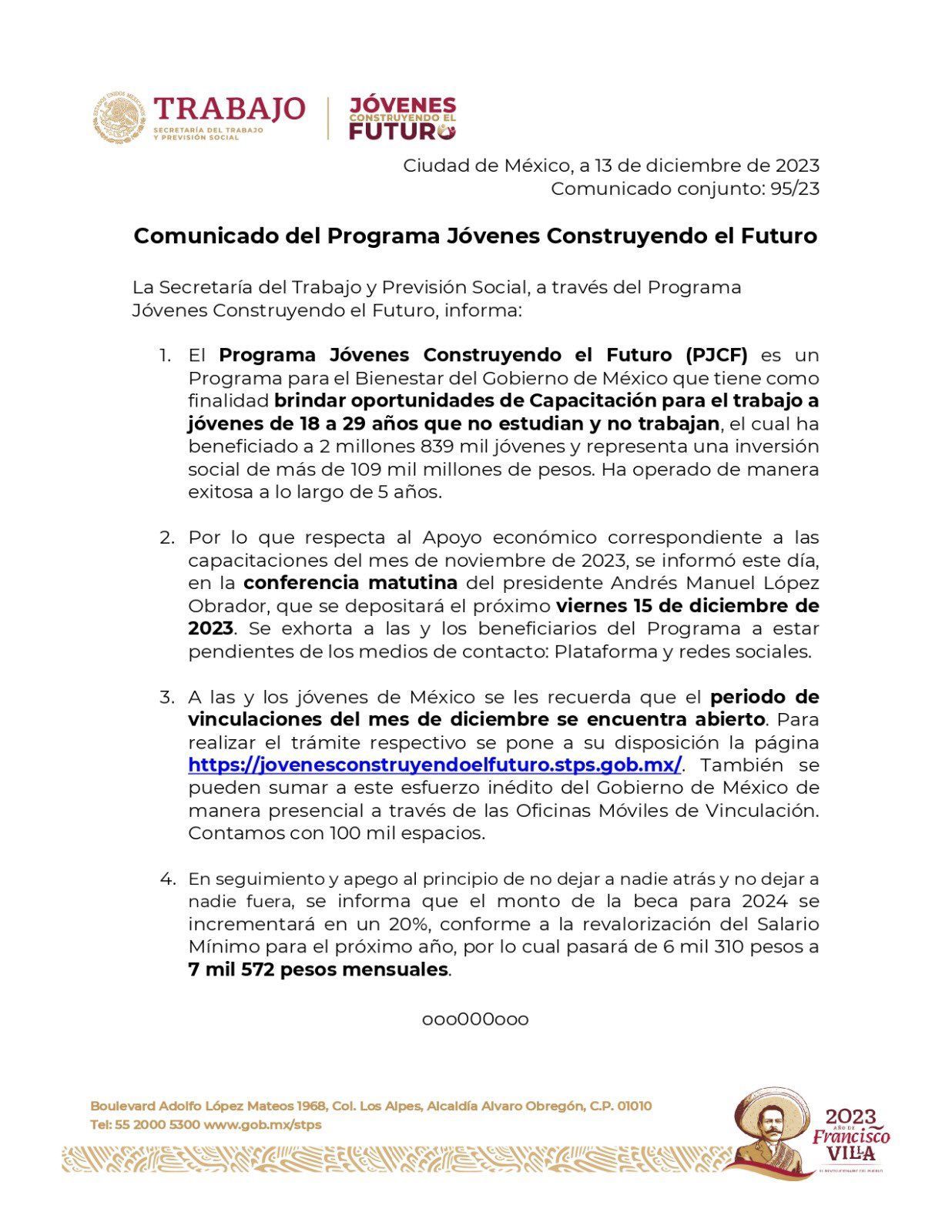 Además, se indicó que para el 2024 se tienen previstas 100 mil vacantes más, en donde los interesados pueden inscribirse en la liga http://jovenesconstruyendoelfuturo.stps.gob.mx.