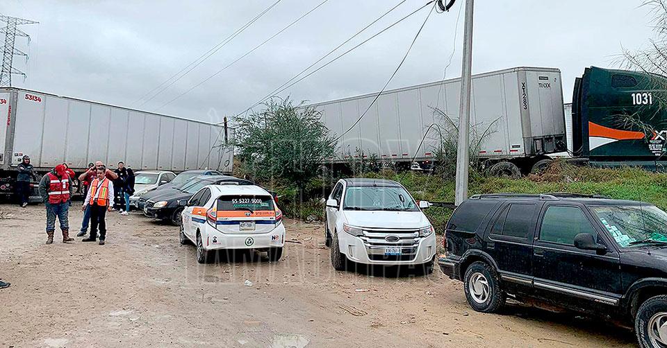 Nuevo Laredo, Tamaulipas.— Al perder el control por el suelo resbaladizo debido a la llovizna, el chofer de un tráiler se salió del Libramiento Mex 2 en Nuevo Laredo y chocó contra al menos nueve vehículos que se encontraban estacionados afuera de una línea transportista.