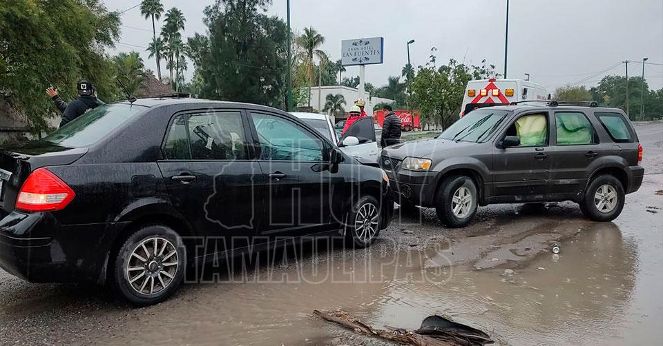 Ciudad Victoria, Tamaulipas. – Dos mujeres lesionadas y cuantiosos daños materiales, dejó como saldo un accidente vial esta mañana, en el que se vieron involucradas tres unidades de fuerza motriz.