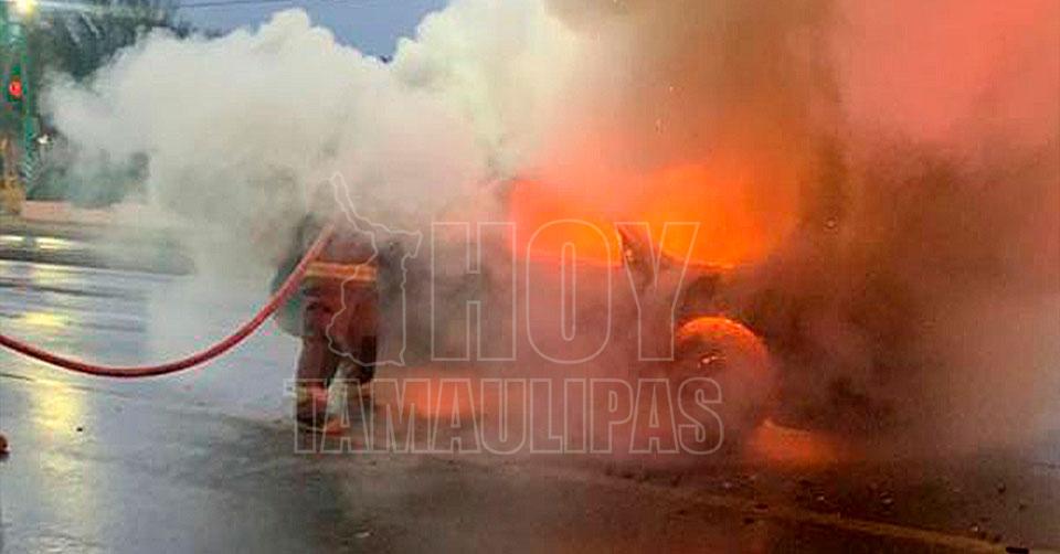 Nuevo Laredo, Tamaulipas.— Una mujer estuvo a punto de morir en su vehículo, que se incendió tras ser chocado por una camioneta que huyó en plena avenida Reforma de Nuevo Laredo.