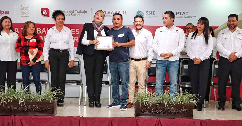 En representación de la secretaria del Trabajo y Previsión Social, Olga Patricia Sosa Ruíz, presidió este evento el subsecretario de Empleo y Previsión Social Abelardo Flores Mendoza, quien hizo un reconocimiento por la disciplina y entrega demostrada durante su encomienda a cada uno de las personas que como beneficiarios del Programa de Movilidad Laboral tuvieron la oportunidad de trabajar en el extranjero, originarios de los municipios de Tampico, Madero, Altamira, González, El Mante, Aldama y Ocampo.