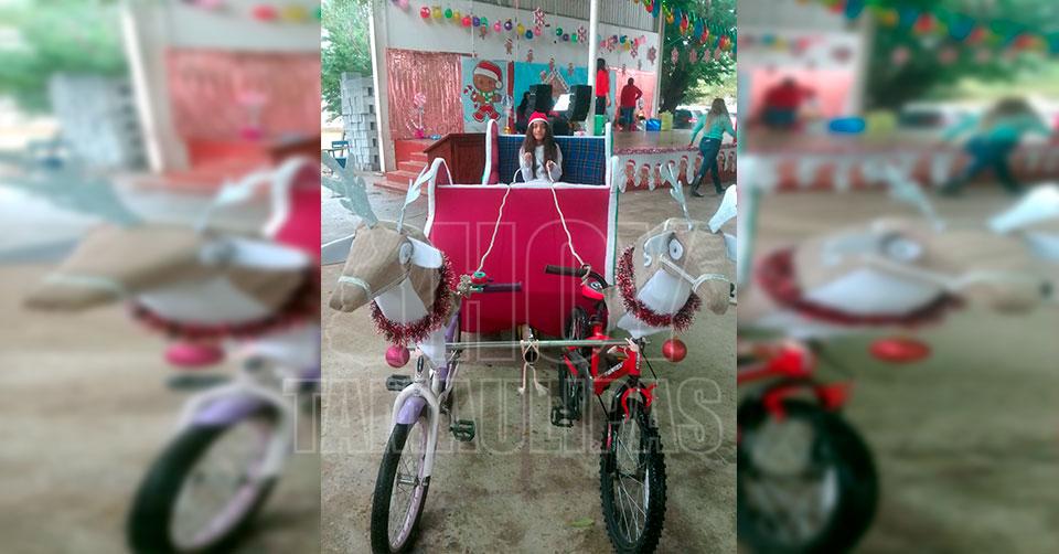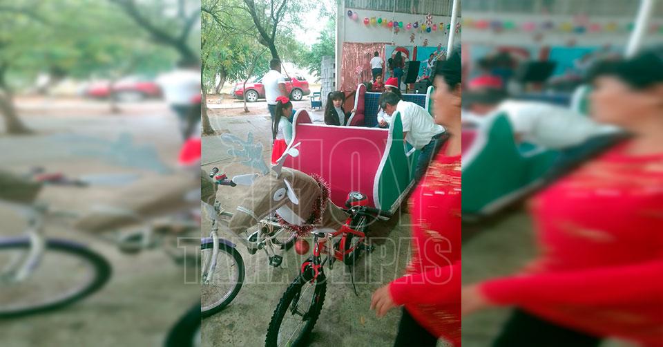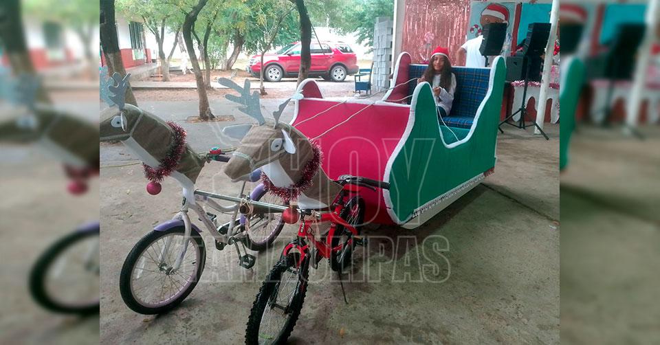 Reynosa, Tamaulipas. - Para hacer feliz a su nieta en esta época navideña, don Gabino Obregón decidió fabricar un trineo, pero no uno cualquiera, sino una jalado por bicicletas.
