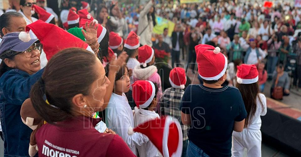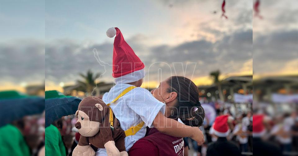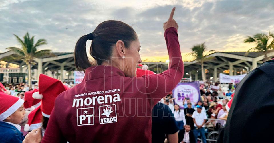 Ciudad Madero, Tamaulipas. - Con un atardecer espectacular y la brisa que genera el mar, la doctora Claudia Sheinbaum Pardo cantó villancicos navideños, participó en romper la piñata y dio a conocer sus sueños por seguir con la transformación de México.