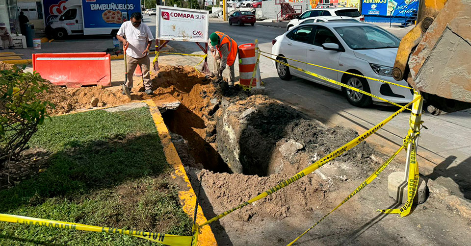 La tubería colapsó debido a que concluyó su tiempo de vida útil, por lo que trabajadores de COMAPA SUR atendieron de manera inmediata esta situación en la que se labora de manera acelerada, con la finalidad de concluir a la mayor brevedad.