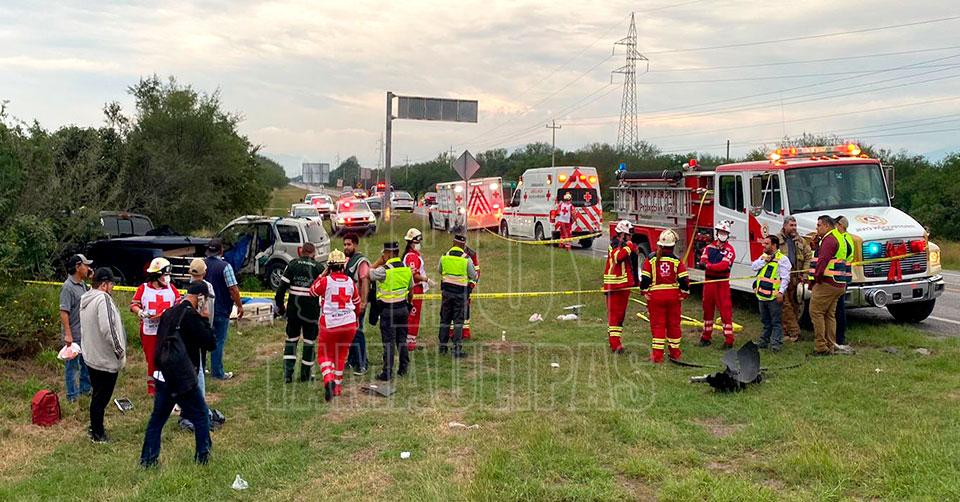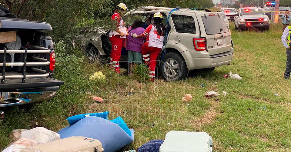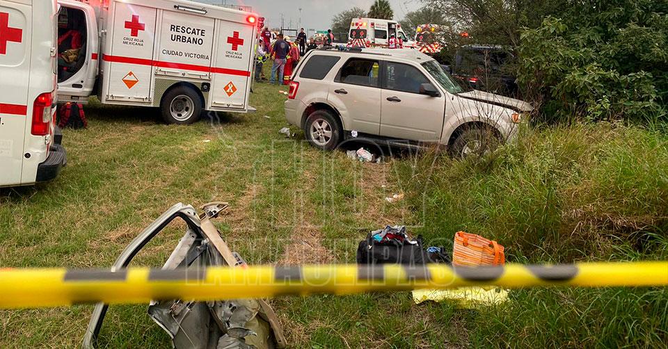 Güémez, Tamaulipas. - Un muerto y 13 personas heridas es el saldo que dejó el choque entre una camioneta Escape donde viajaba una familia procedente de Reynosa con destino al Mante con una F-150 donde se desplazaban paisanos en el kilómetro 14 de la carretera Victoria Matamoros, en el punto conocido como la joroba.